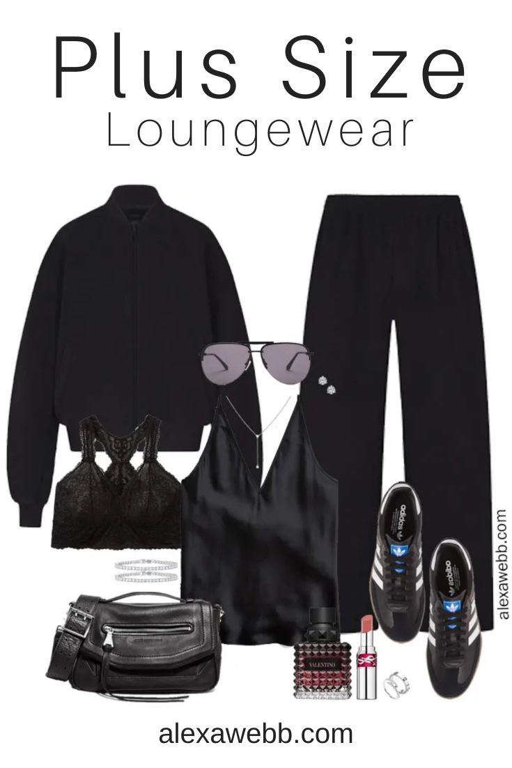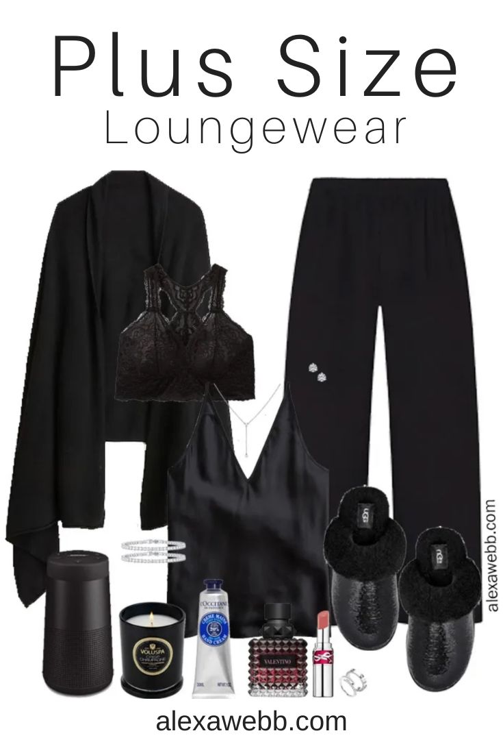 A plus size black luxury lounging outfit that can quickly go from relaxing at home to running errands with just a few changes.