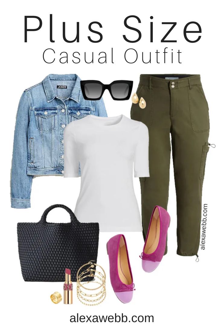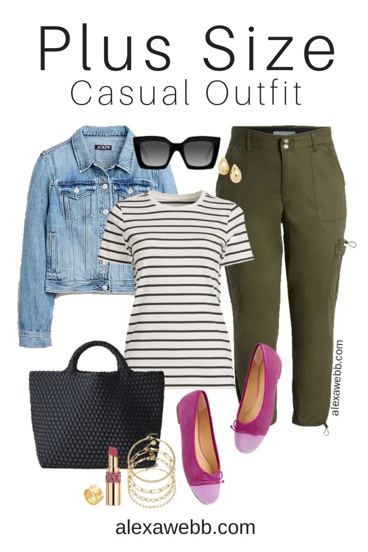 Yes, stripes! A plus size black and ivory striped tee with some trendy olive green cargo pants.