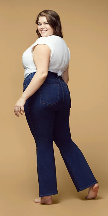 The jeans are from Good American and called “Good Flare.” They have a high rise waist and are made of a very stretchy denim that retains it’s shape. I purchased some similar “Good Flare” jeans for my mom and she is in love with them! She is a tall apple and says they fit her perfectly! Another thing I love about Good American is that their website shows each item in a variety of sizes.