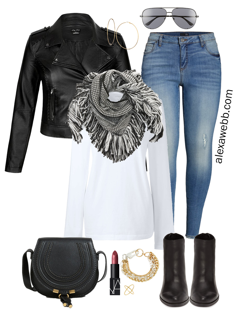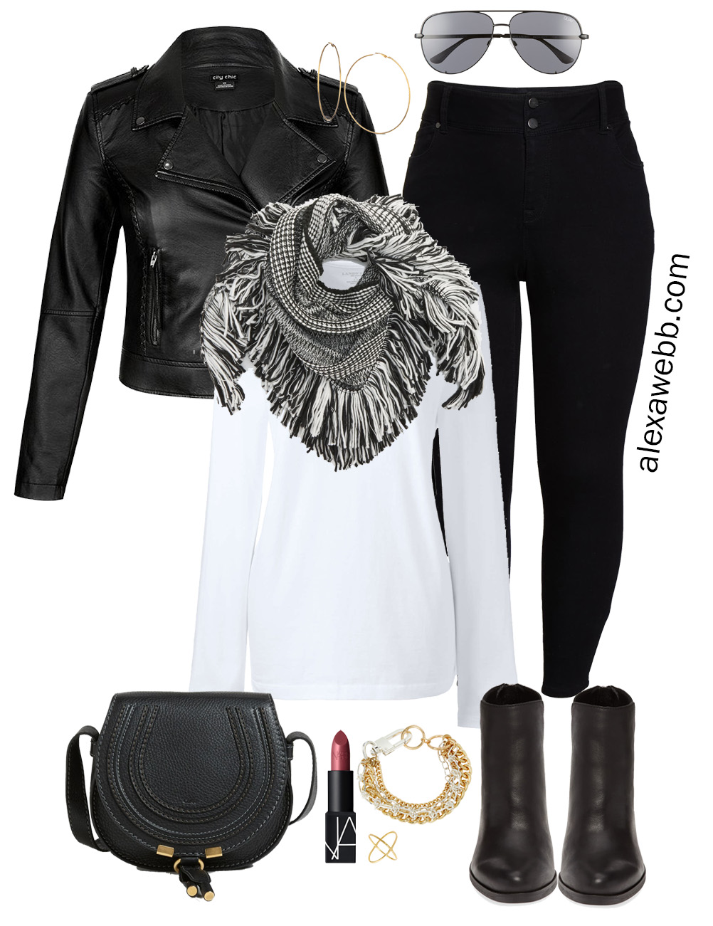 Alexa does a fab job with the outfits she puts together. You can tell she puts a lot of time and thought into what she presents. All of the clothes are plus size. Some stores like Nordstrom sell items on their site that are both straight AND plus size and those options come up at the same time when you click on “size”. City Chic has their own sizing scheme. I have noticed that stores and brands usually show images of plus size clothes from the smaller size end of their plus sizes. If you read the description of the leather jacket, it says the model is wearing a size 14 in the jacket. My guess is that there are “sample sizes” for plus-size clothing that are used for print and runway just as there are for straight sizes. That is another fashion industry issue we could debate 24/7. Point is, it is unfair to say Alexa is not showing plus size clothing; she is, but she can only use the images of the clothing the stores and brands provide, which seem to be those smaller plus sizes.