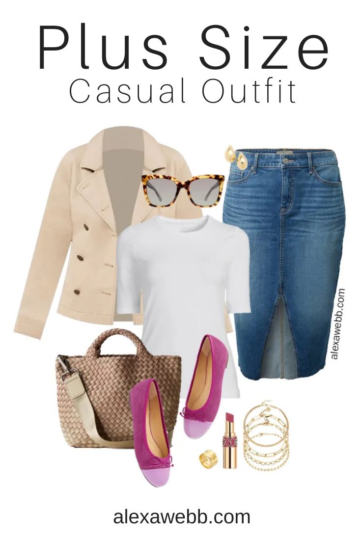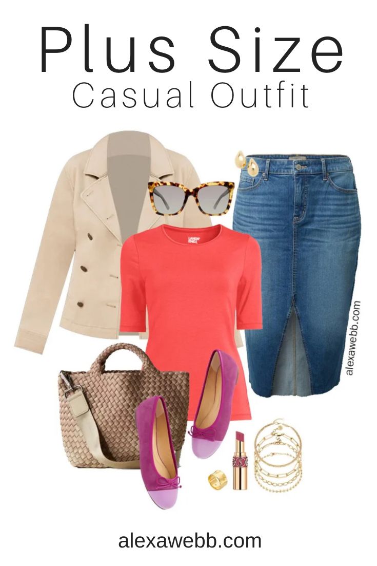Two chic plus size midi denim skirt outfits for casual spring time outings.